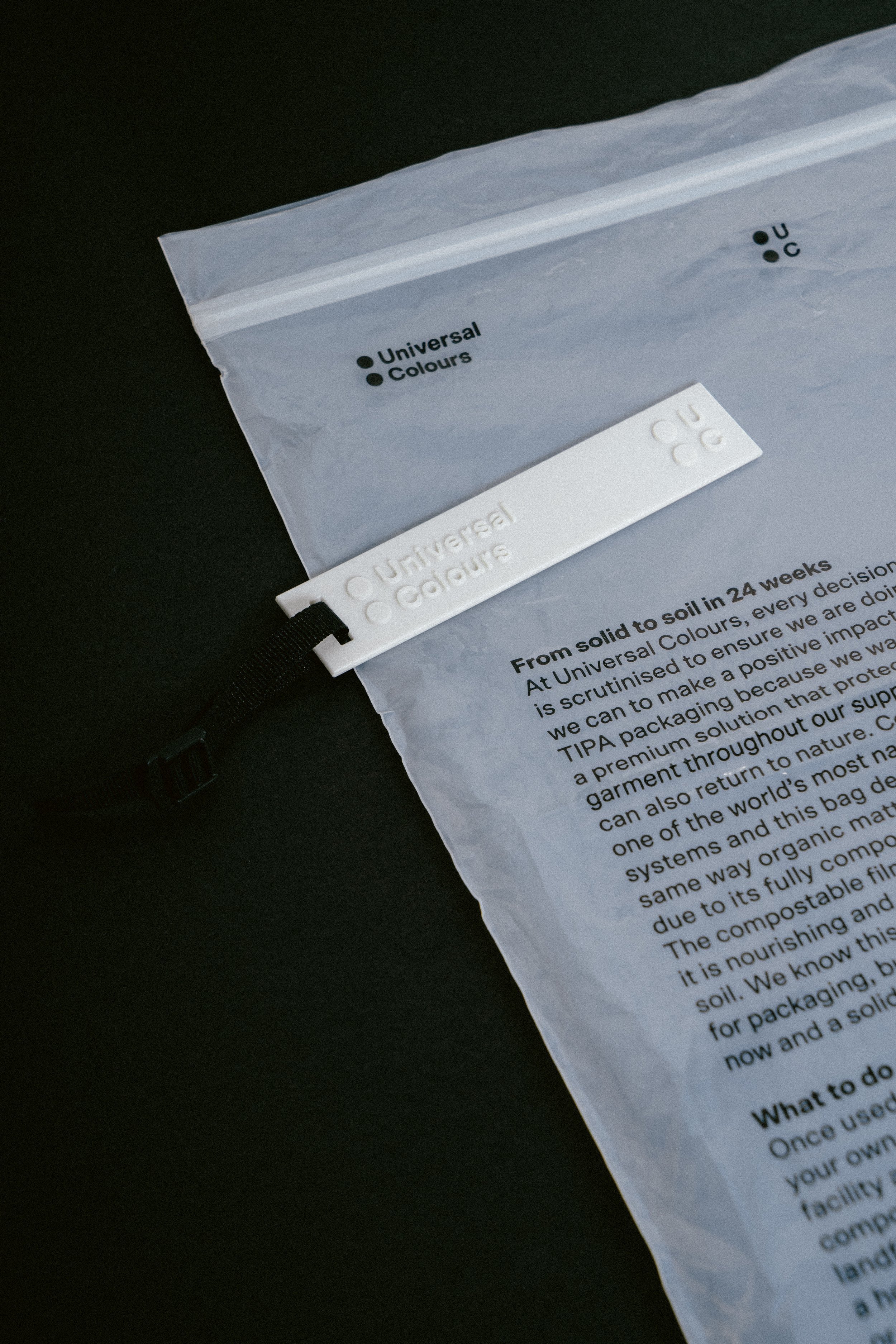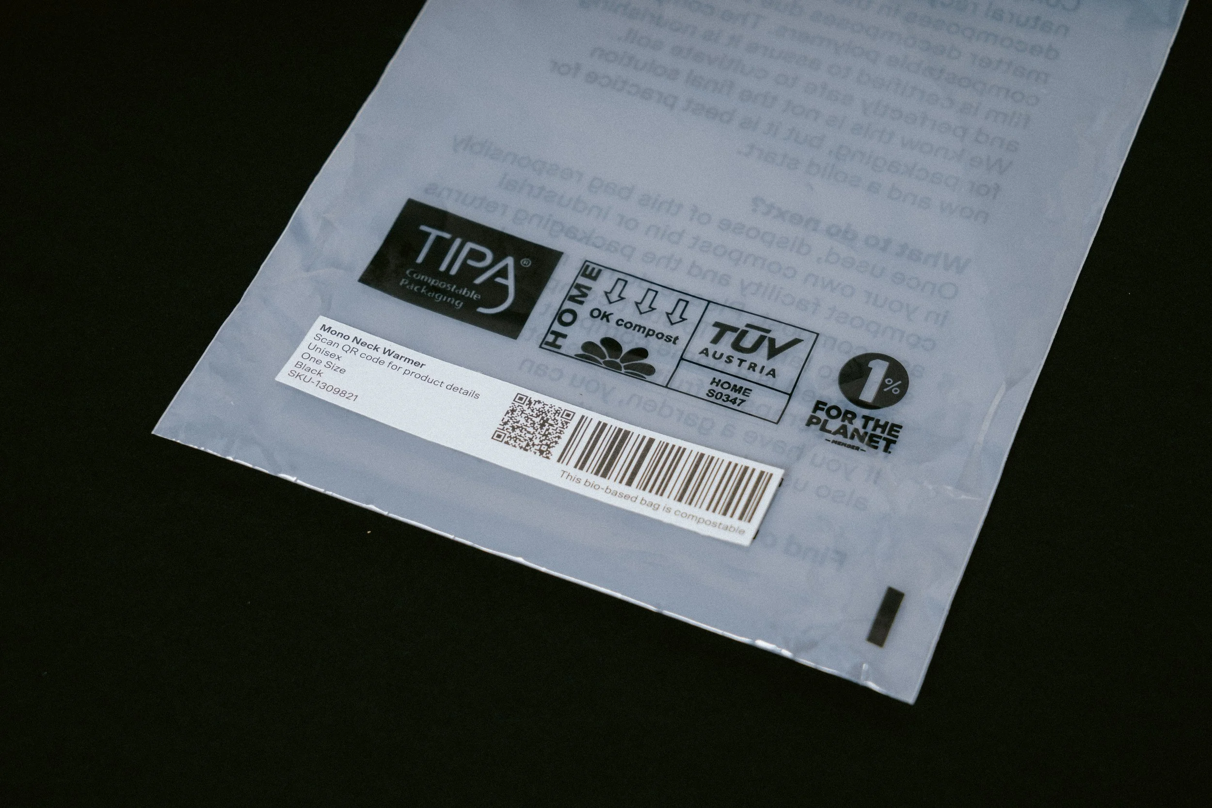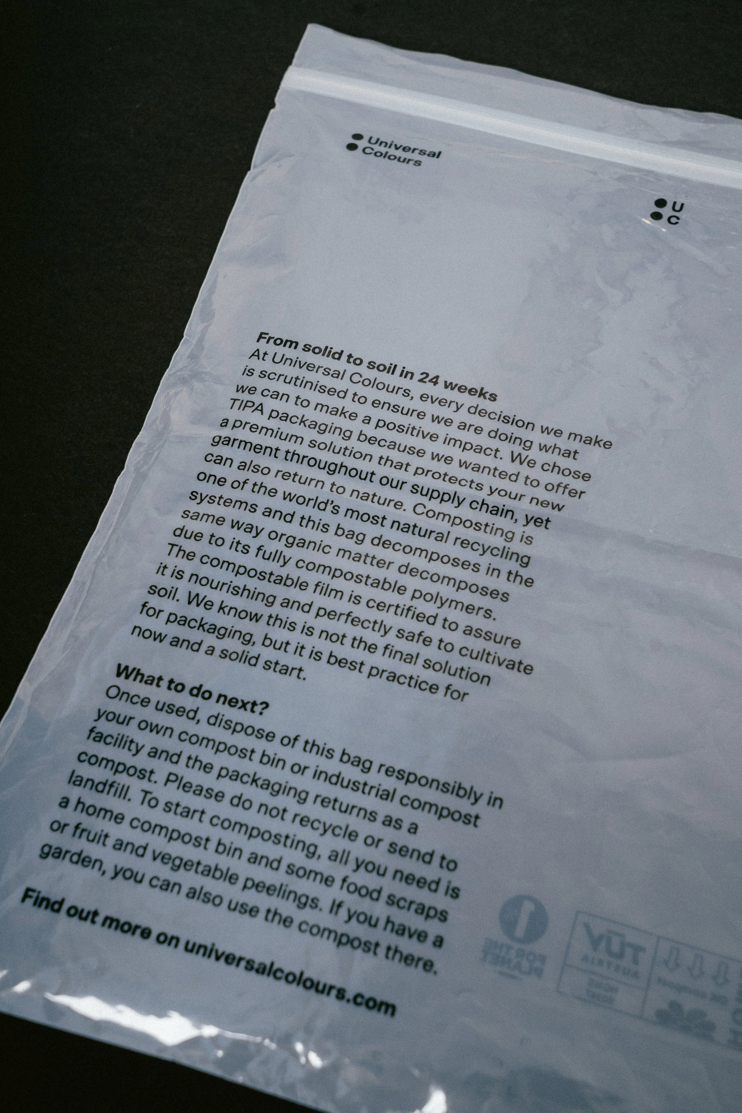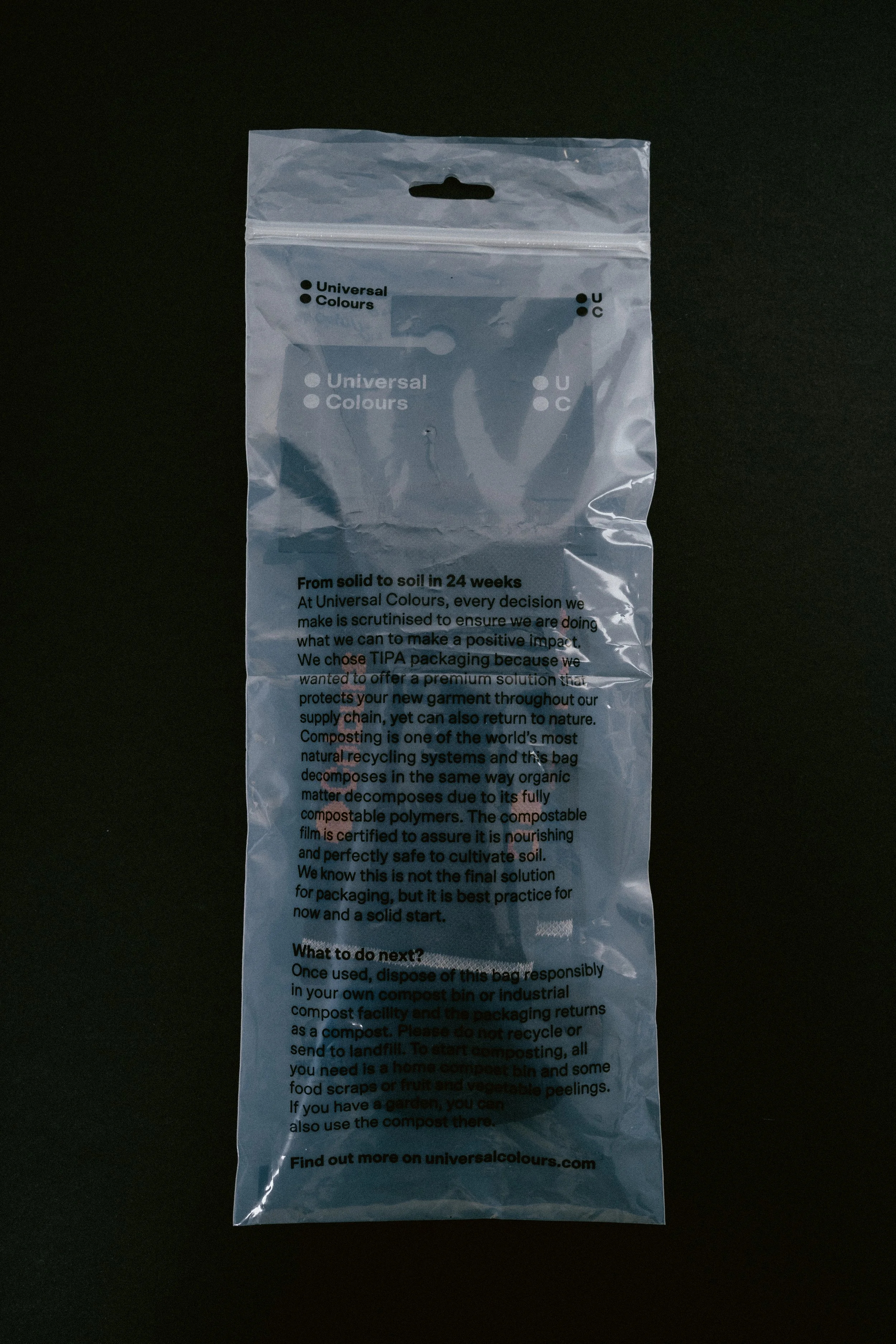 As part of our ongoing commitment to reducing our footprint, we're introducing TIPA compostable packing for all of our current and future garments. This packaging emulates the properties of traditional plastic bags, whilst being fully compostable under home and/or industrial conditions.